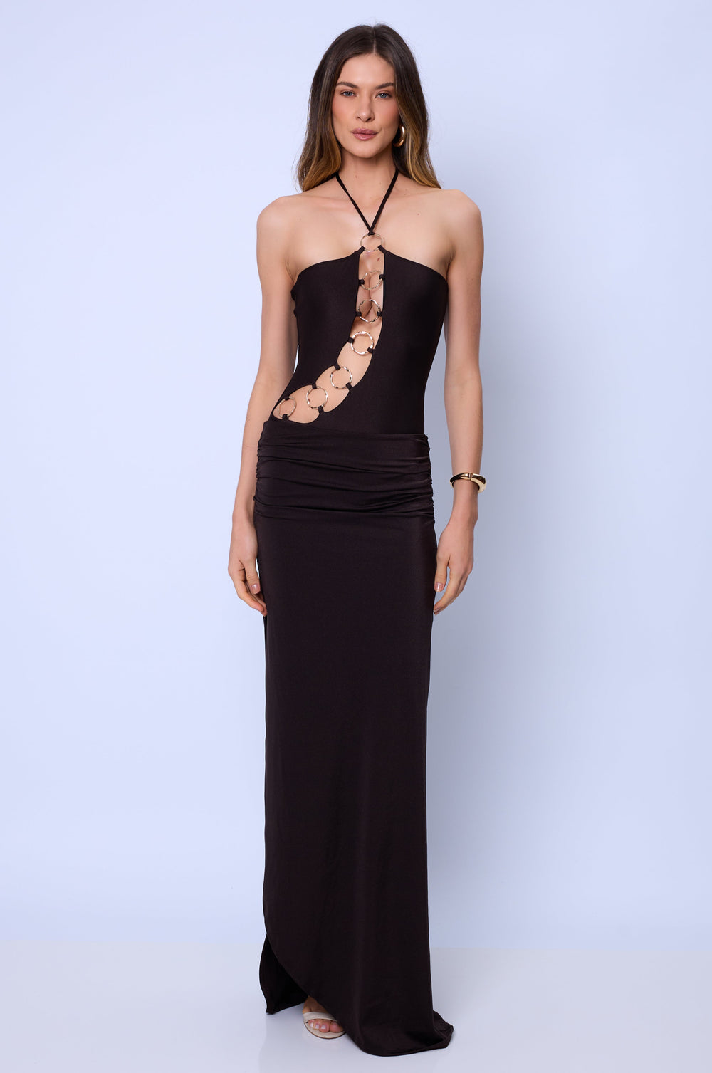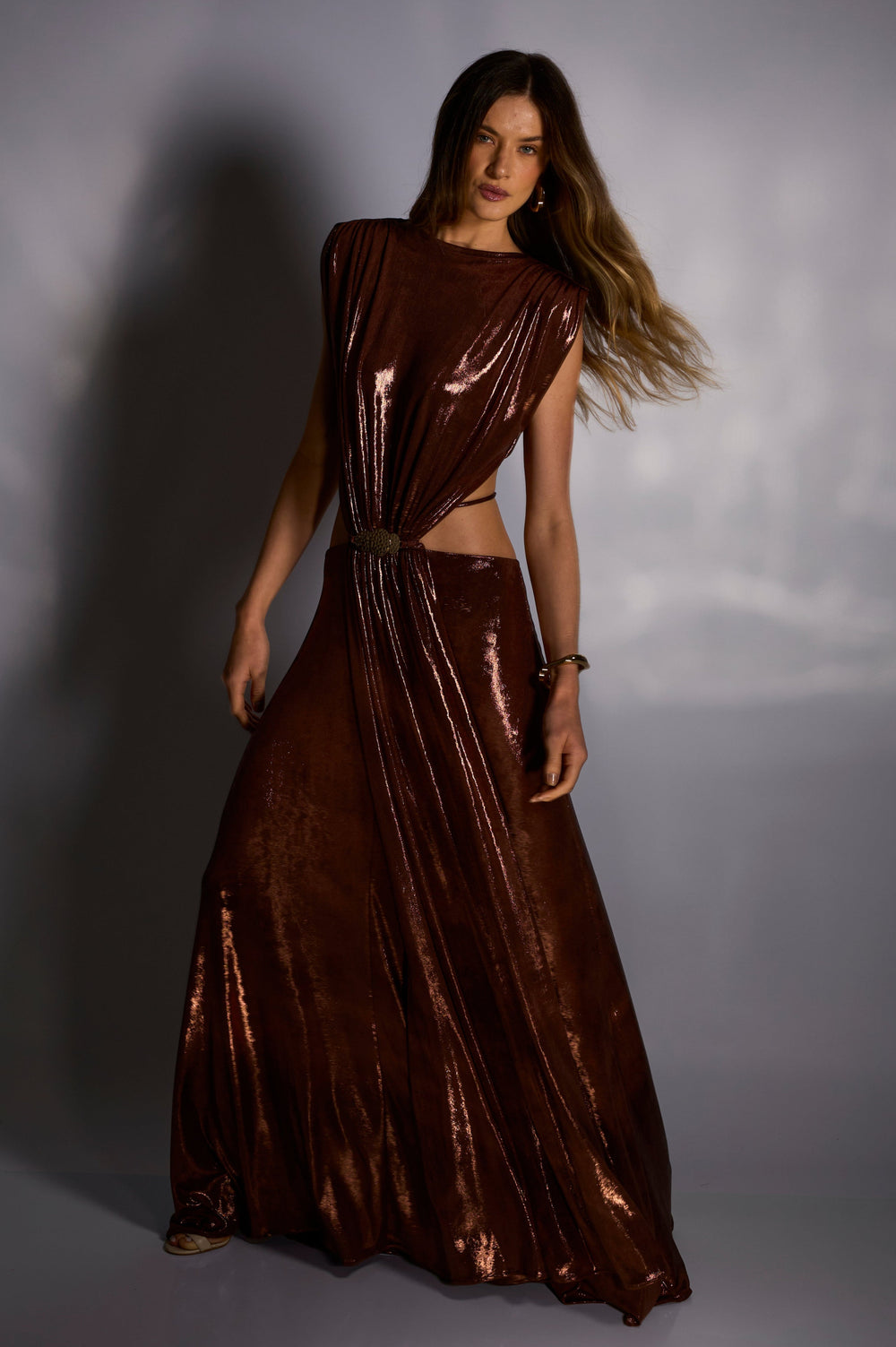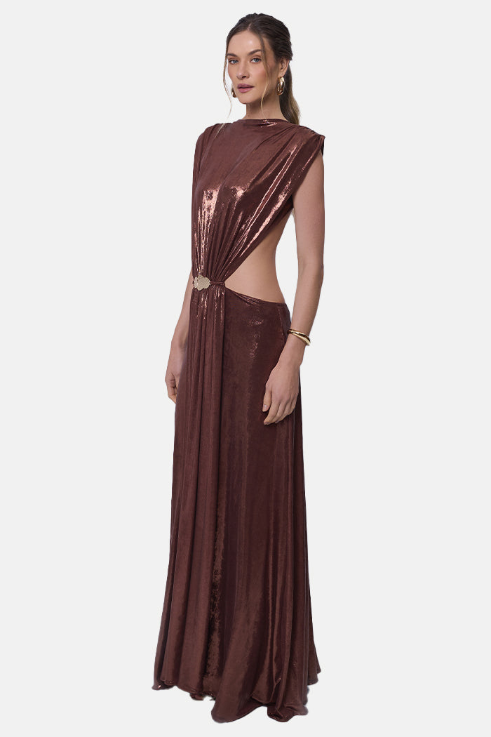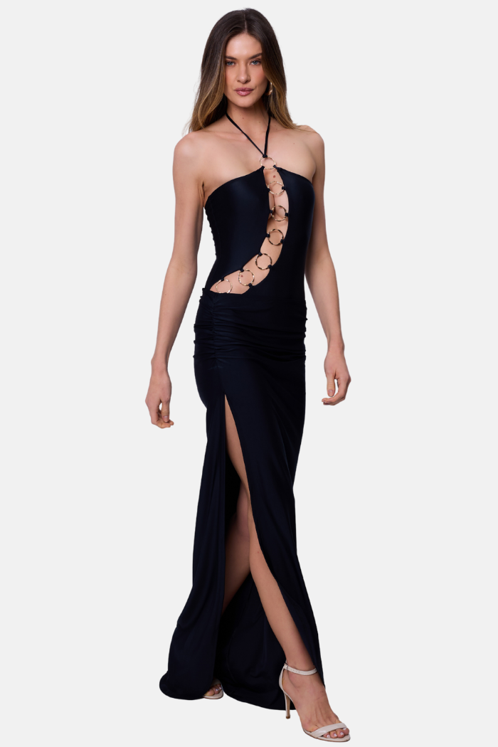 O tecido com brilho é lindo. Não incomoda muito mas também não é o mais confortável. Fica bem justinho no corpo e o drapeado da saia equilibra. Perfeito!