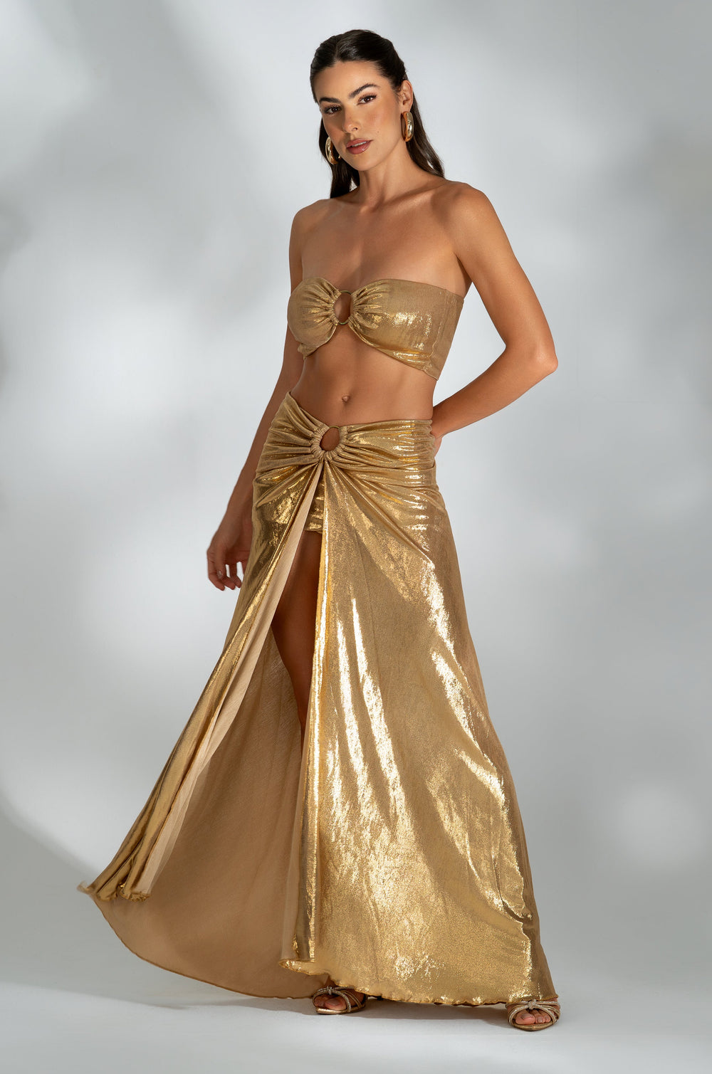 SAIA – A saia longa possui fenda frontal que também pode ser posicionada com a fenda na lateral, pois possui cós com elástico que permite ajuste versátil na cintura. O detalhe drapeado na parte superior valoriza a silhueta e é finalizado com uma argola central forrada, que harmoniza com o design do top, criando uma composição coesa e elegante.