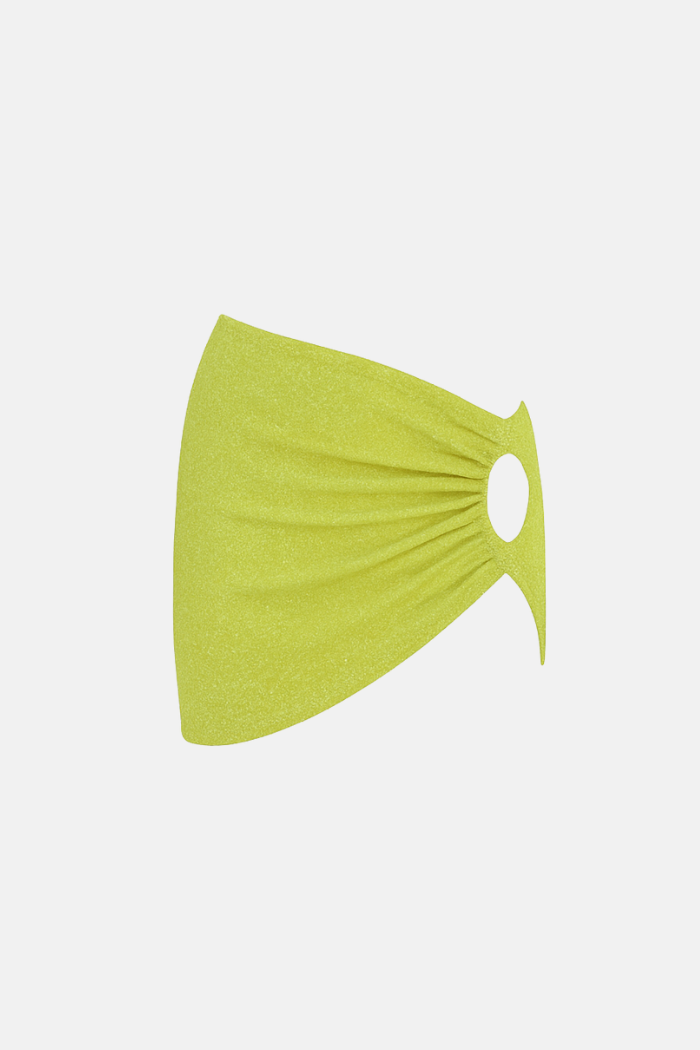 O Conjunto é composto pelo top + calcinha + saia, confeccionado na malha com lurex.