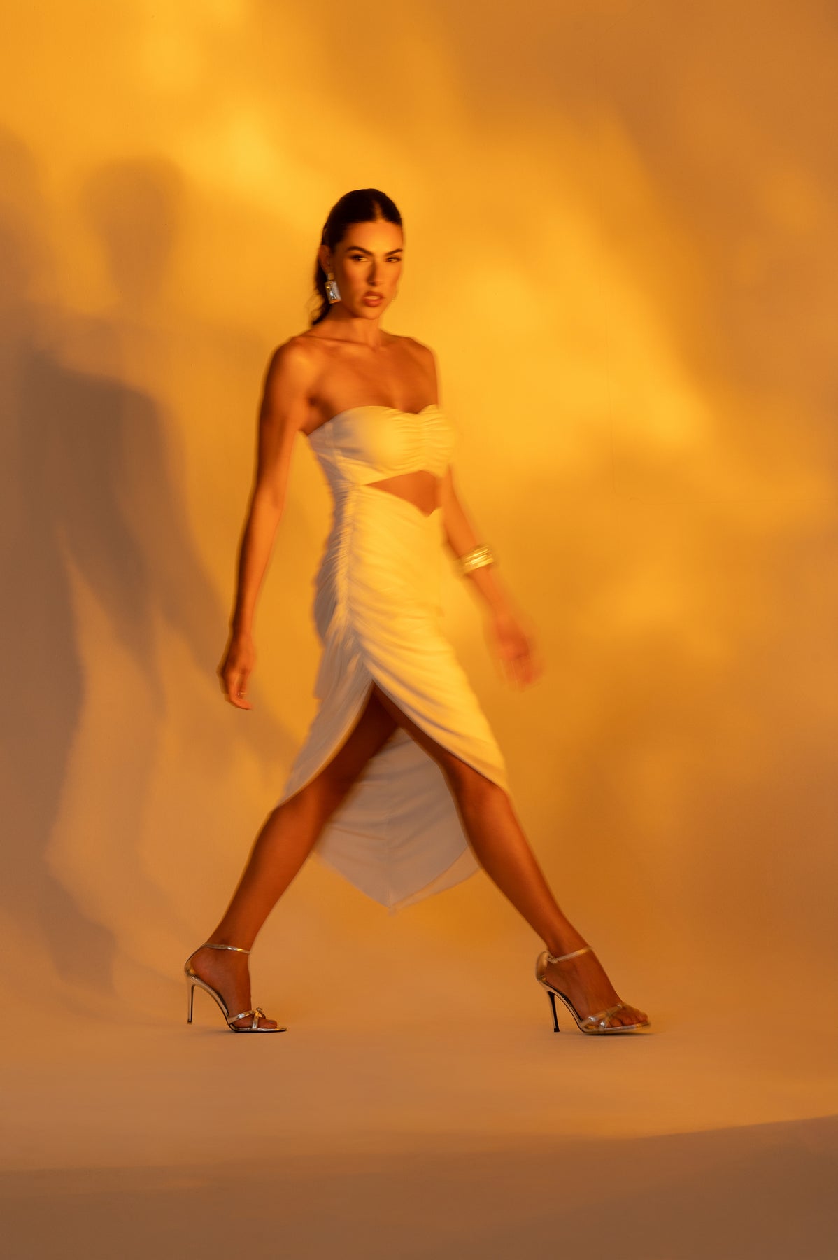 Sua modelagem ajustada ao corpo é enriquecida pelo efeito drapeado. A assimetria da barra traz movimento e modernidade, enquanto a capa removível — com gola alta e ombros marcados — permite transformar o vestido em duas propostas distintas: com capa ganha imponência e sofisticação; sem ela, revela-se um tomara que caia.
