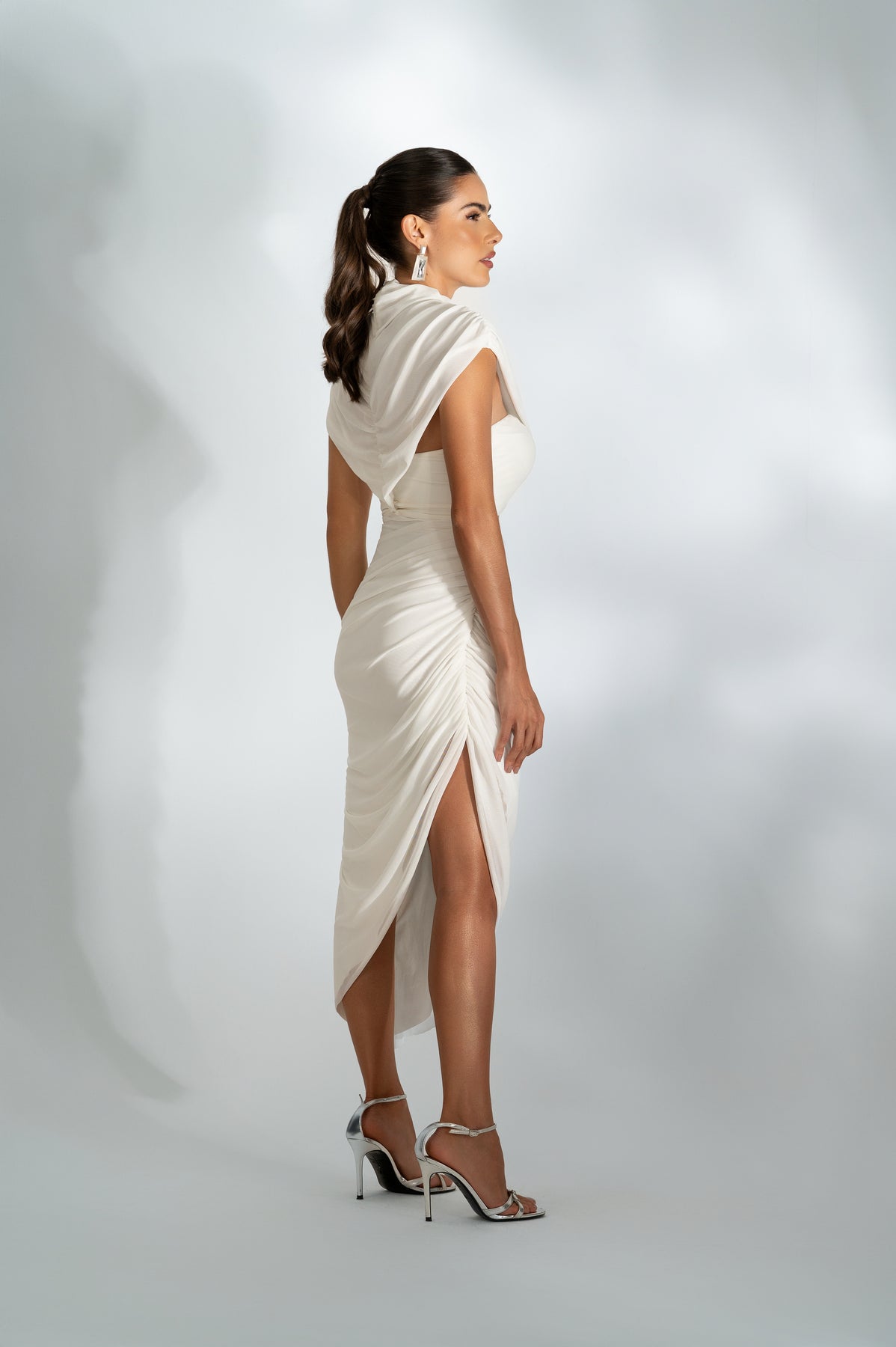 Vestido Assimétrico Drapeado Com Capa Removível Off