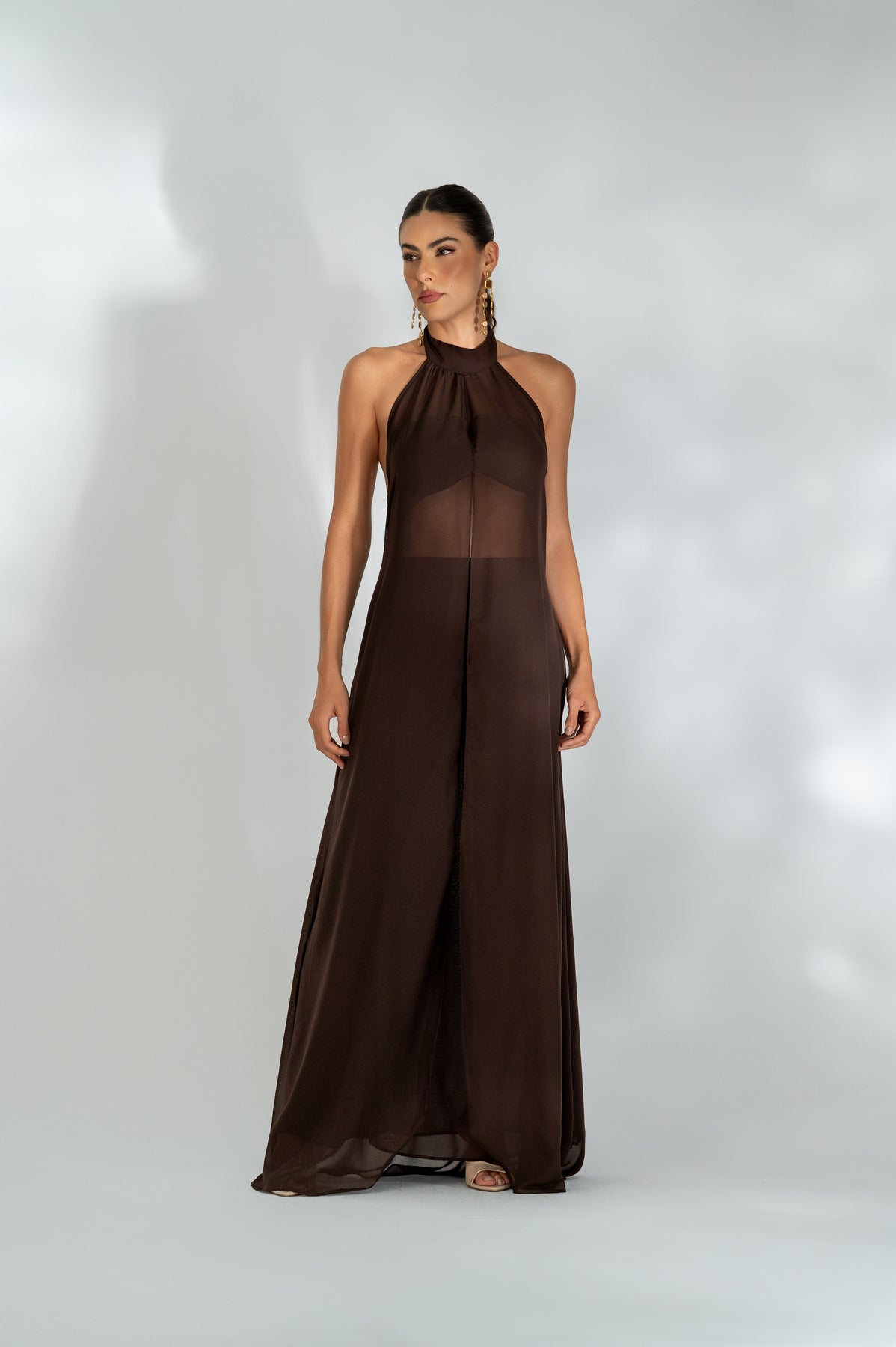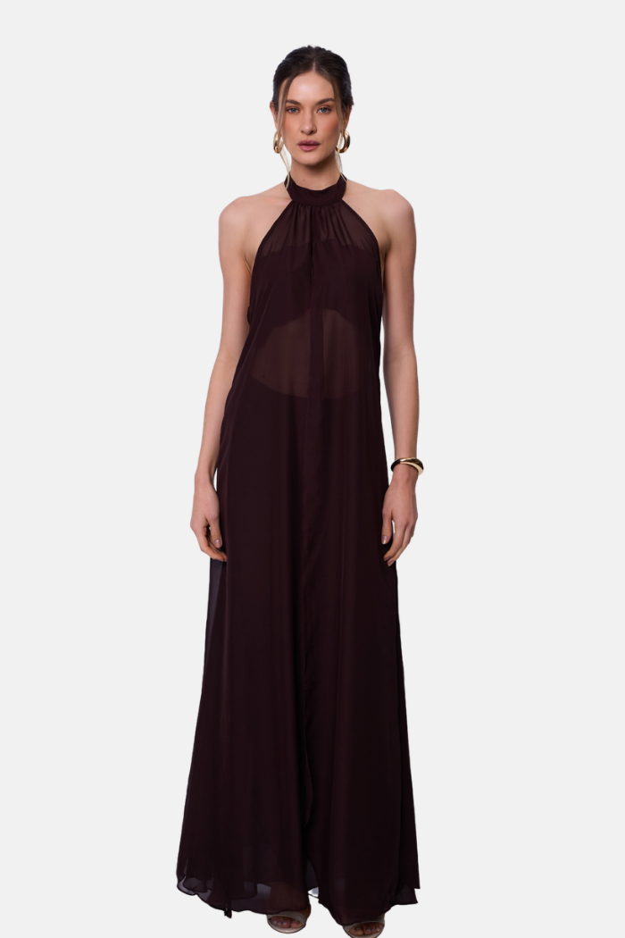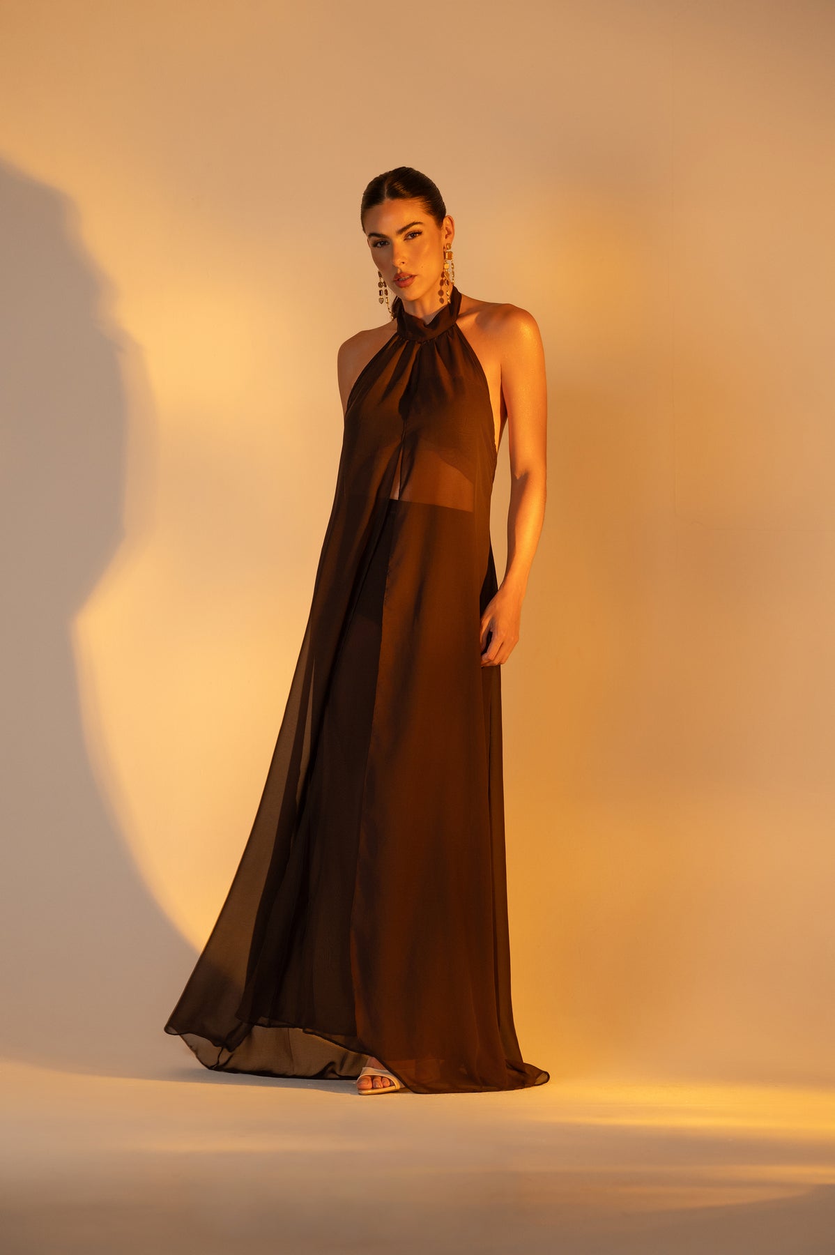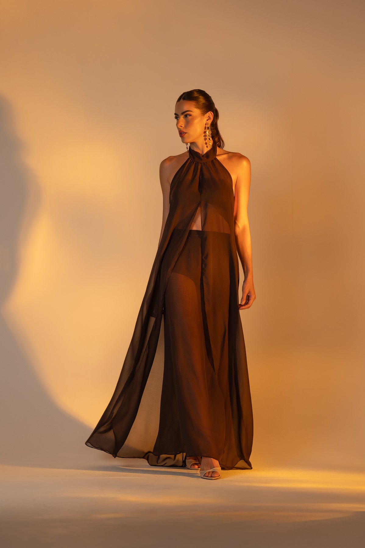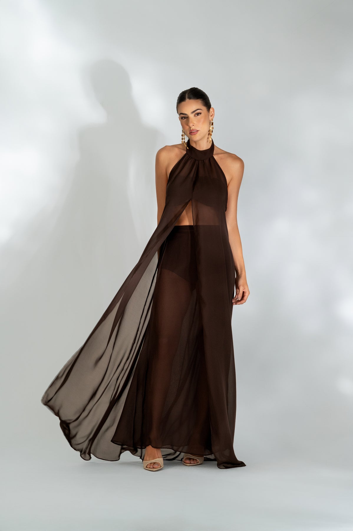 A Capa Longa Gaia é uma peça sofisticada e etérea, confeccionada em crepe com transparência e caimento leve, que revela movimento e versatilidade. Com abertura frontal fluida e recorte frontal, revela sutilmente a silhueta de forma elegante. Possui forro interno na região do busto, oferecendo maior conforto e segurança, o que permite também seu uso em propostas mais casuais.